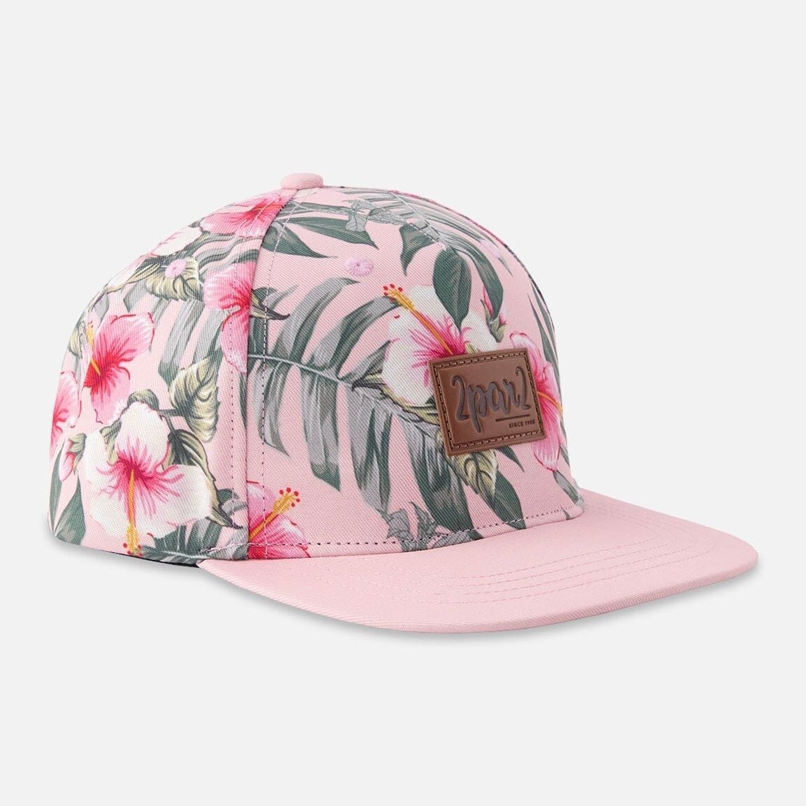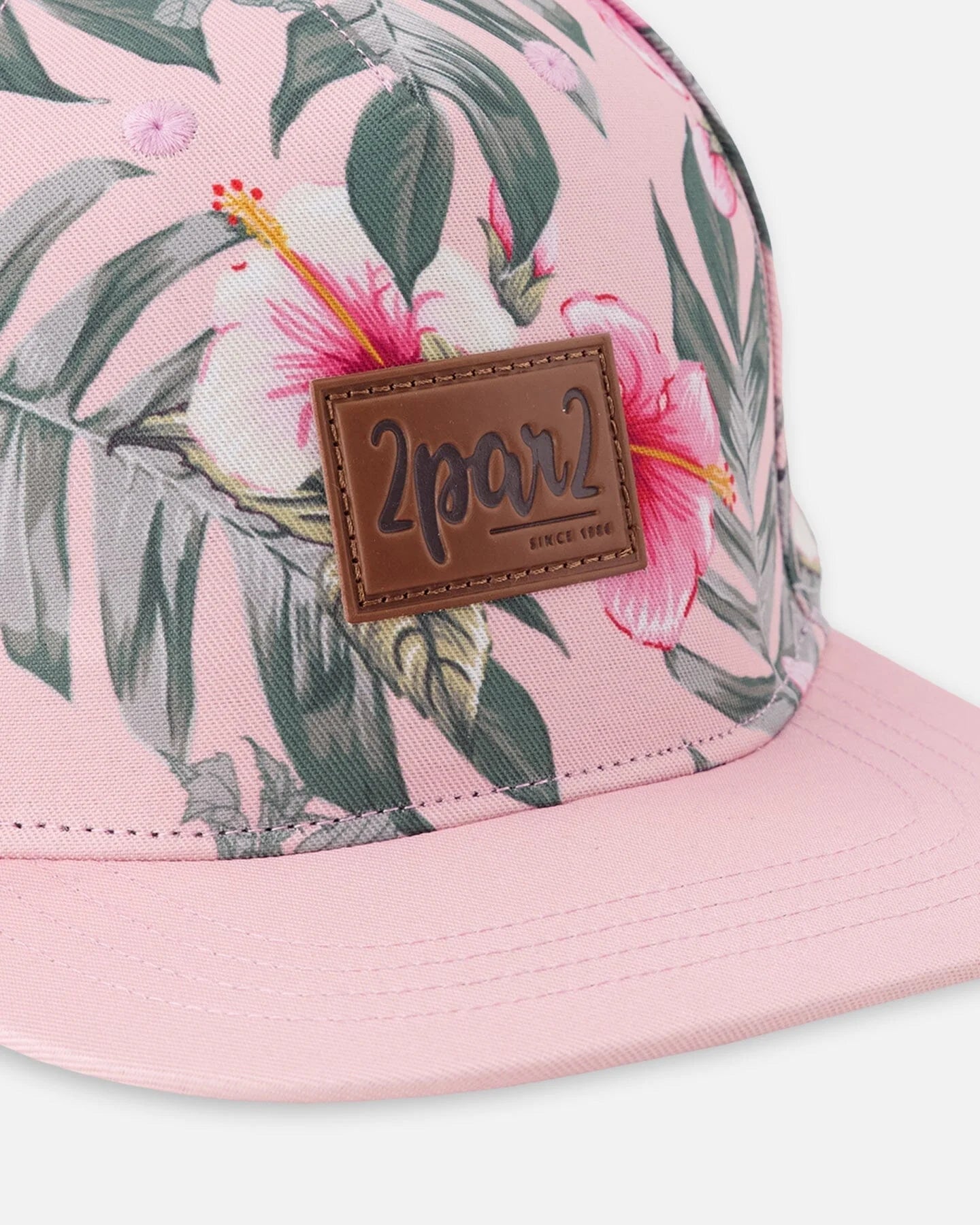 The cap in pink with hibiscus print brings sunny personality to little outfits. This hat features a flat brim for a modern look, an allover floral motif, and a front “2par2” logo label that adds a signature touch. Crafted in 100% polyester, it’s lightweight and durable—perfect for park days, beach walks, and every bright adventure.
