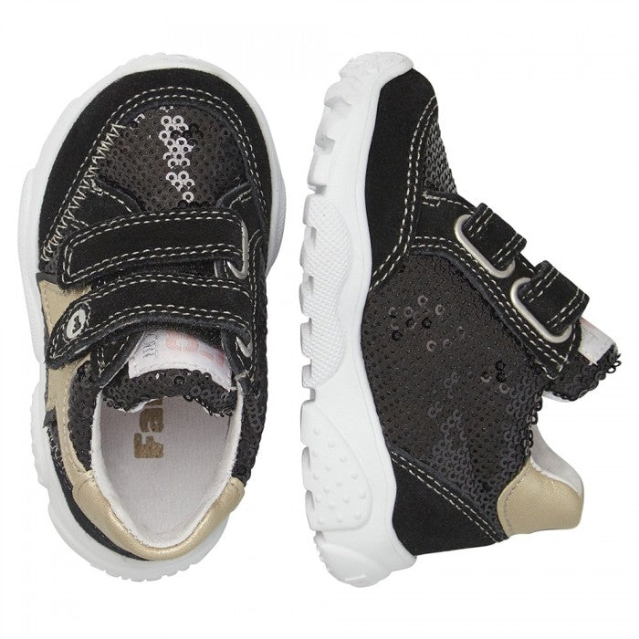 This super-glamorous Falcotto sneaker features a sequin-embroidered fabric upper and golden leather details. The iconic construction features a wide, roomy toe, a reinforced heel and an anatomical insole. It's easy to put on thanks to the two velcro straps and the ultra-light rubber running sole gives it a sporty edge.