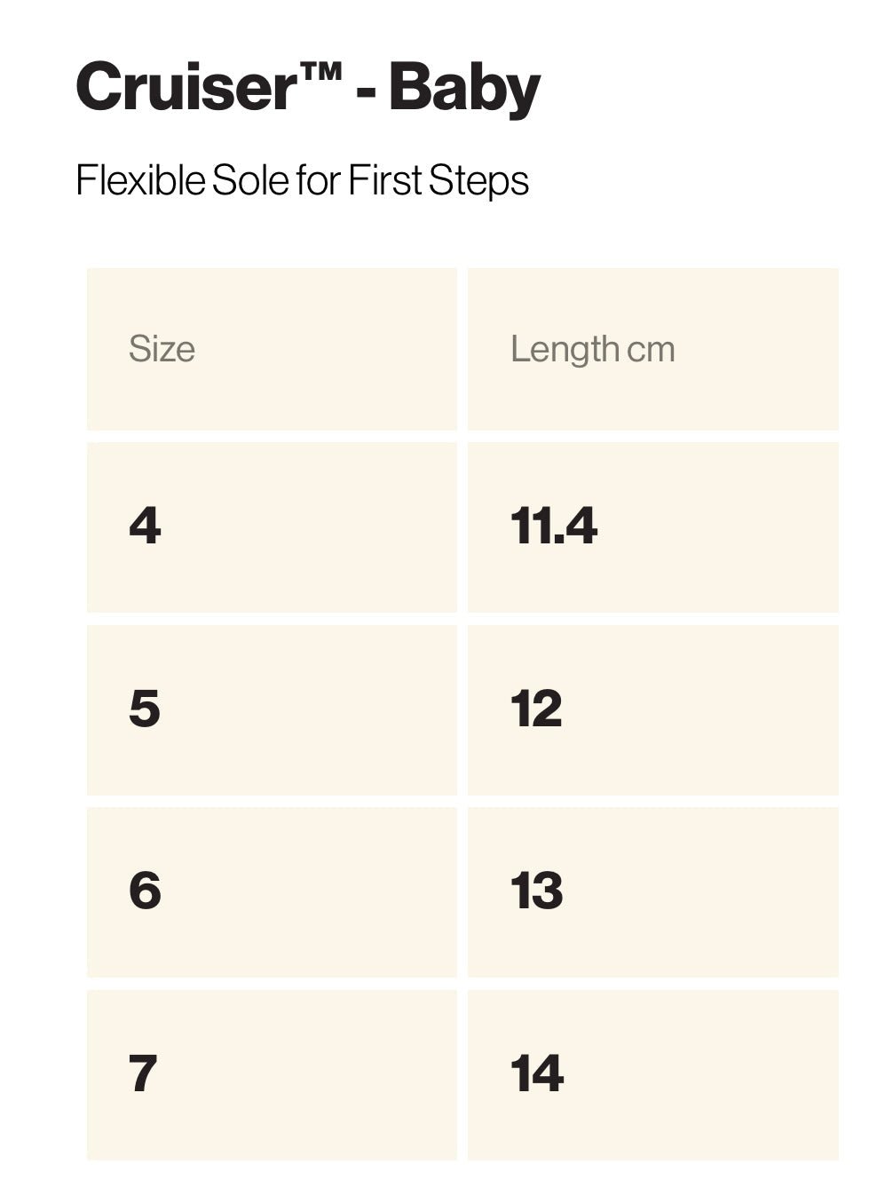 Help your baby walk faster and with confidence! The Cruiser is a lightweight children’s shoe scientifically designed to support early walking. With sturdy ankle support and a flexible sole, this shoe will help your little one stand up and improve their balance.