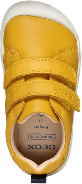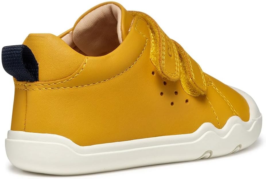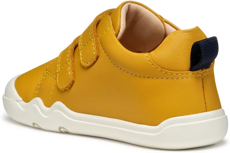 Lightweight low-cut sneaker for babies with an extremely comfortable design that recreates the natural sensation of walking barefoot. This attractive version of Steppieup in an ochre and navy-blue colourway has a practical double-riptape closure for ease of adjustability. Crafted from buttery-soft nappa, it has an especially slender and flexible outsole as well as a reinforced toe which protects little feet and cossets them with a sensation of well-being.