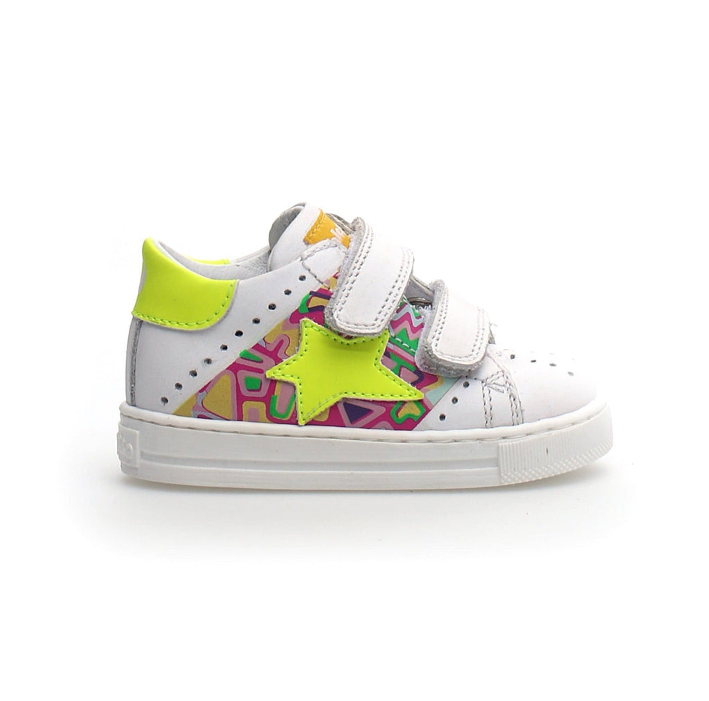 Playful and colourful, these sneakers come have full leather upper features perforations on the toe and side, as well as a cool multi-coloured print with neon details. The two velcro straps ensure a comfortable fit and make them easy to get on, as does the anatomical insole. Non-slip rubber sole.