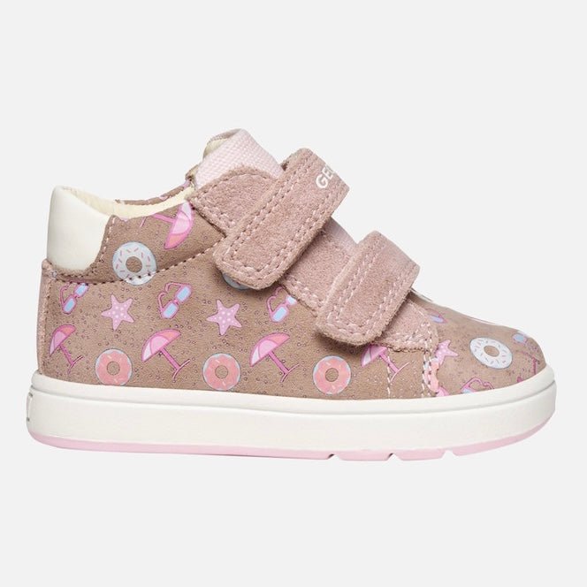 Baby girl’s lightweight comfortable first-steps sneaker with a casual-chic aesthetic. This version in light rose & white features an upper strewn with shimmering shapes and will add trendy appeal to any outfit. Crafted from soft shiny suede and pearlescent leather, Biglia fastens with a practical velcro strap closure and rests on a breathable flexy outsole, providing both support and a blissful sensation of well-being.
